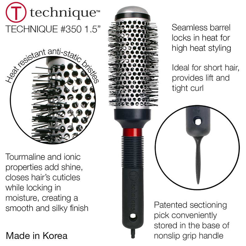 Technique Thermals are designed with tourmaline ionic bristles that hydrate both the hair shaft and scalp. The heat-resistant, static-free bristles help control flyaways while providing antimicrobial protection to prevent bacteria growth. A practical hair sectioning pick is conveniently stored in the base of the suede-like handle, giving you everything you need in one brush.