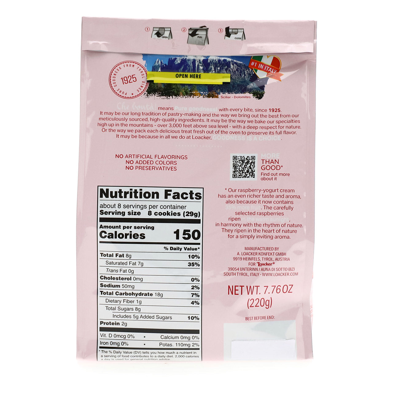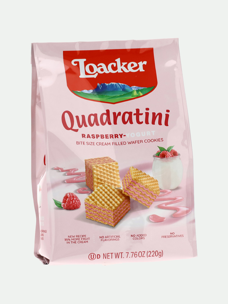 Experience the taste of summer! The secret of these exquisite cubes is the refreshing raspberry-yogurt cream. The raspberries, sun-ripened in fertile soils and strictly Non-GMO, are exclusively grown in the open air. The yogurt is made from 100% Non-GMO Alpine milk. This resealable bag contains 55 bite size premium wafer cookies filled with finest Raspberry-Yogurt cream. Loacker Quadratini are ideal for sharing with friends and loved ones or perfect to enjoy by yourself with a cup of tea or ice tea.
