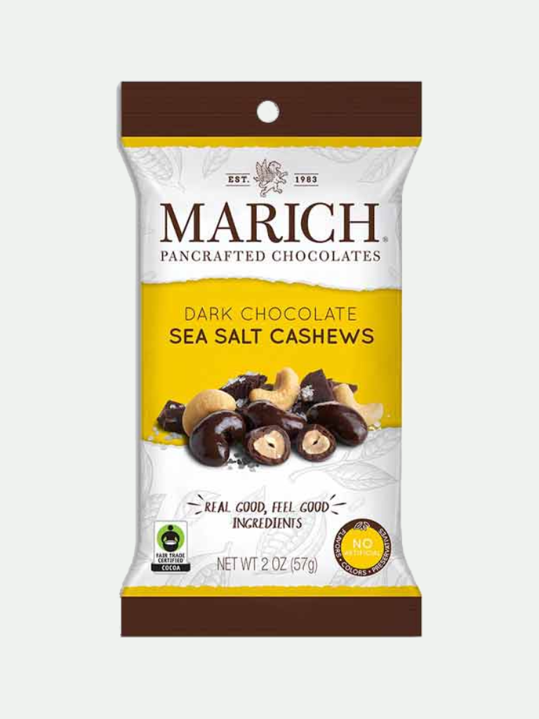 For those who love the combination of nuts and chocolate, Marich Dark Chocolate Sea Salt Cashews are sure to satisfy. Marich starts with freshly roasted cashews and coats them in rich, premium dark chocolate, finished with a hint of sea salt. The result is a deliciously balanced, nutty and chocolatey treat, all in a convenient, grab-and-go package.