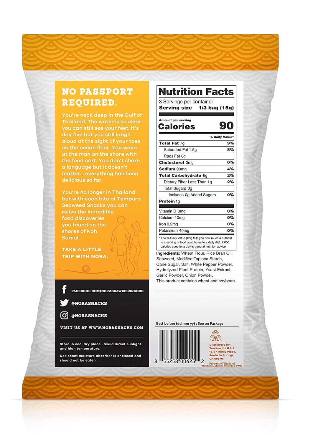 Transport yourself to the enchanting shores of Thailand with Nora's Tempura Seaweed in Original Flavor. This Thai-inspired, crispy treat captures the essence of your unforgettable culinary experiences. Experience the perfect balance of crispiness and indulgence, as this vegan and low-sugar snack takes your snacking game to new heights.