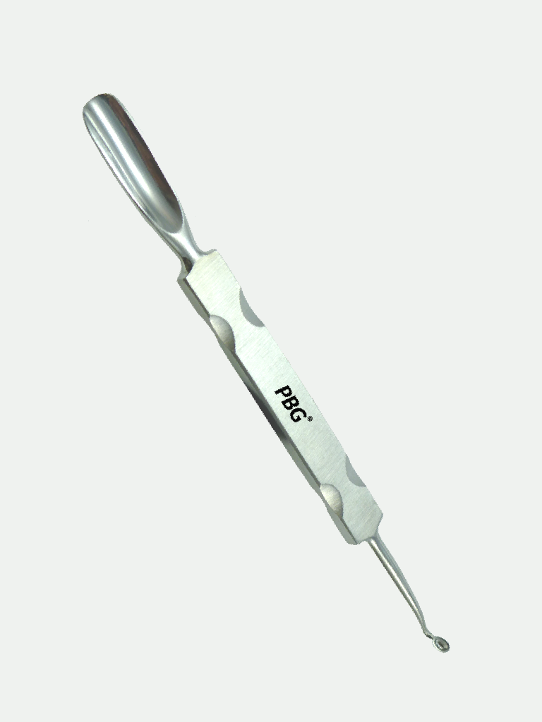High-quality double ended nail curette with spoon cuticle pusher. Made of surgical grade stainless steel, Satin finish. PBG Light-weight pusher provides working comfort and precision. The satin finish makes this implement very pleasant to touch.