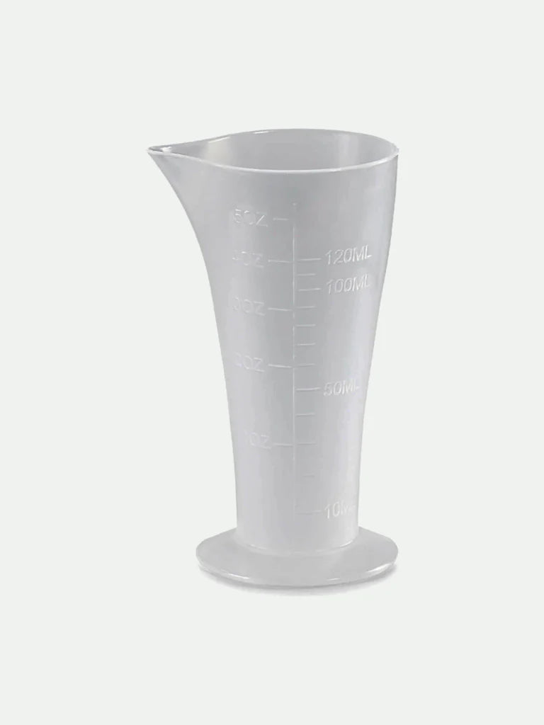 Precisely measure color, developer, and more. Made of sturdy plastic material with embossed measuring scales for the most accurate measurements. Lightweight clear beaker features a convenient pour spout for increased control. Measures up to 5 oz. in 1 oz. increments and up to 120ml in 10ml increments.