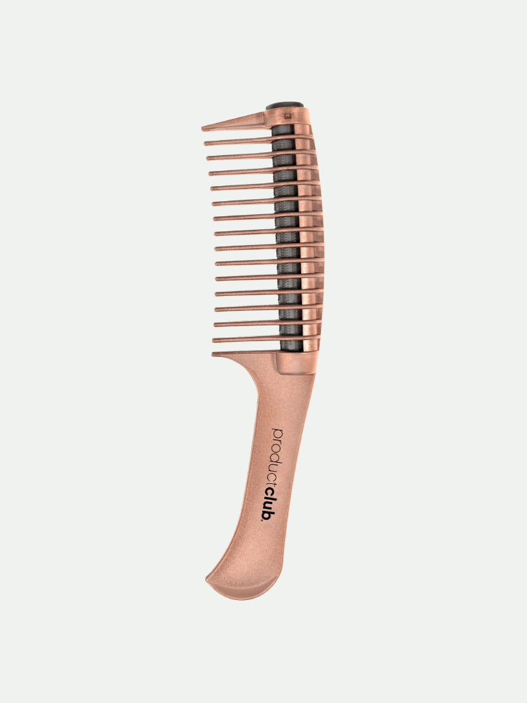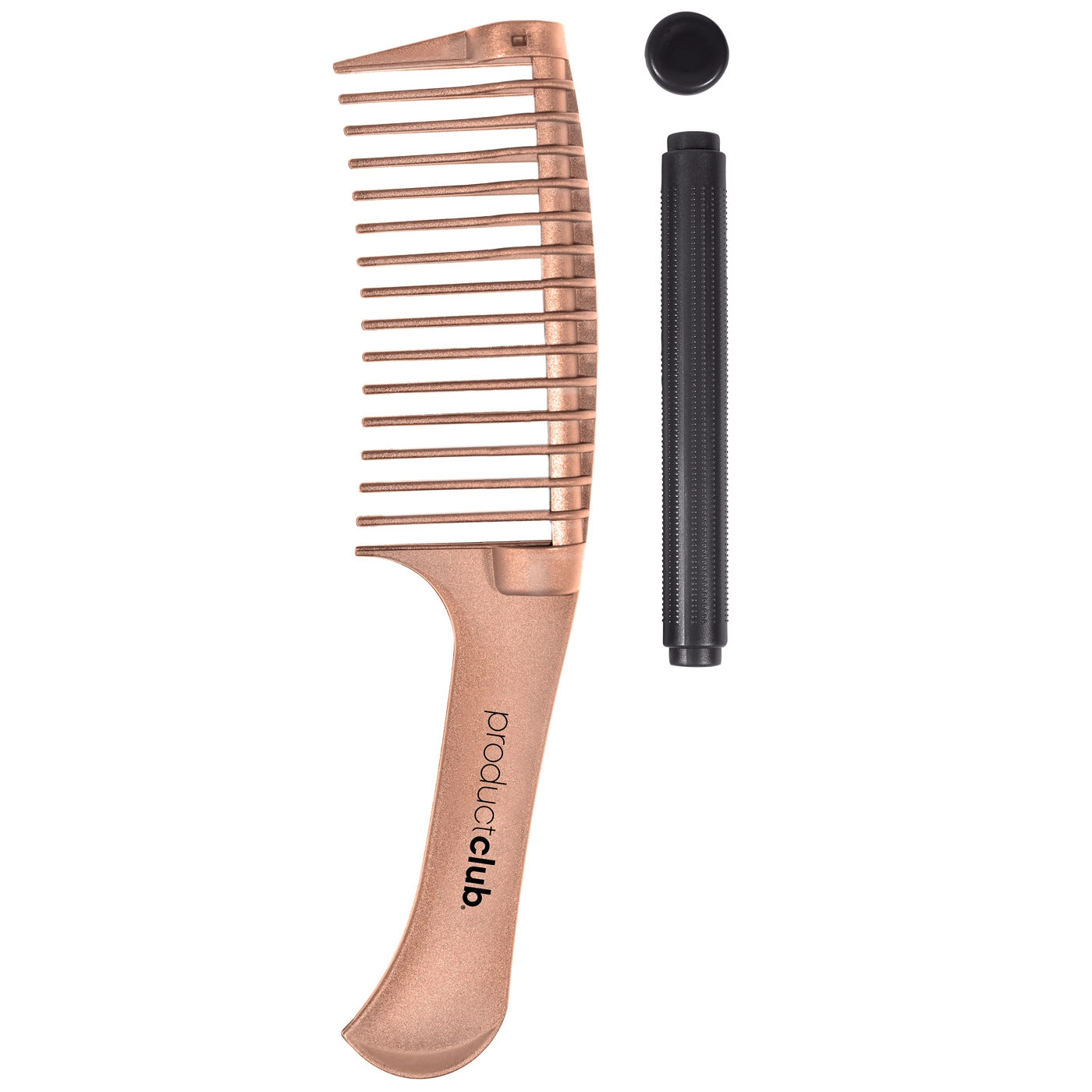A versatile tool for seamlessly distributing numerous products throughout hair. Comb has beautiful rose gold accents, wide teeth that gently separate and detangle, and a textured, integrated roller that evenly blends color, glaze, or conditioner for consistent saturation. Ideal for root smudges and root touch-ups, color melts, glossing, toning, and conditioning treatments. The roller is conveniently removable for easy cleaning. Comb has 16 teeth and measures 9" L.