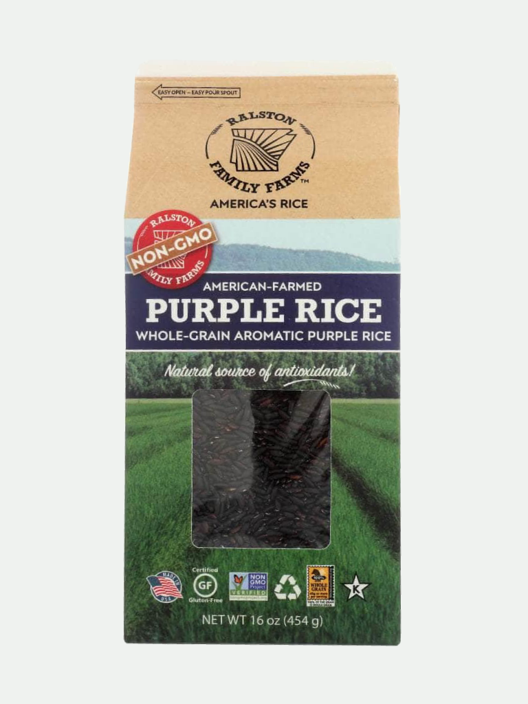 Certified gluten-free. 100% Whole Grain: 45 G or more per serving. 100% of the grain is whole grain. Non-GMO. Non Project Verified. America's rice. American farmed. Whole-grain aromatic purple rice. Natural source of antioxidants! Our specialty whole-grain Red Rice is grown, harvested, and milled right here on our farm. Its rich color comes from a natural plant compound called anthocyanidin, which is also found in blueberries, and it contains more antioxidants than a typical whole-grains brown rice. Naturally fortified with fiber, this all-natural grain artfully combines great taste and exceptional nutrition with ease of preparation. Meat the Ralston Family: Ralston Family Farms is a multi-generational family farm in the Arkansas River Valley. It is here where we put care into growing, harvesting, and milling our artisanal traditional and aromatic varieties of rice. Our rice filed are flooded with because being good stewards of the land has always been important to use, we grow sustainably and ecologically for future generations. We hope you enjoy our non-GMO, naturally gluten-free, American farm-milled rice - from our family to your table! - Ralston Family Farms. Easy open. Made in USA.