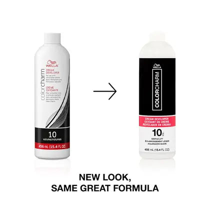 The new Wella ColorCharm 10 Volume Cream Developer is specially formulated to provide optimal gray blending for a seamless, natural look. To use, simply mix 1 part Color Charm color with 2 parts of the 10 Volume Developer and apply using a bowl and brush or applicator bottle.